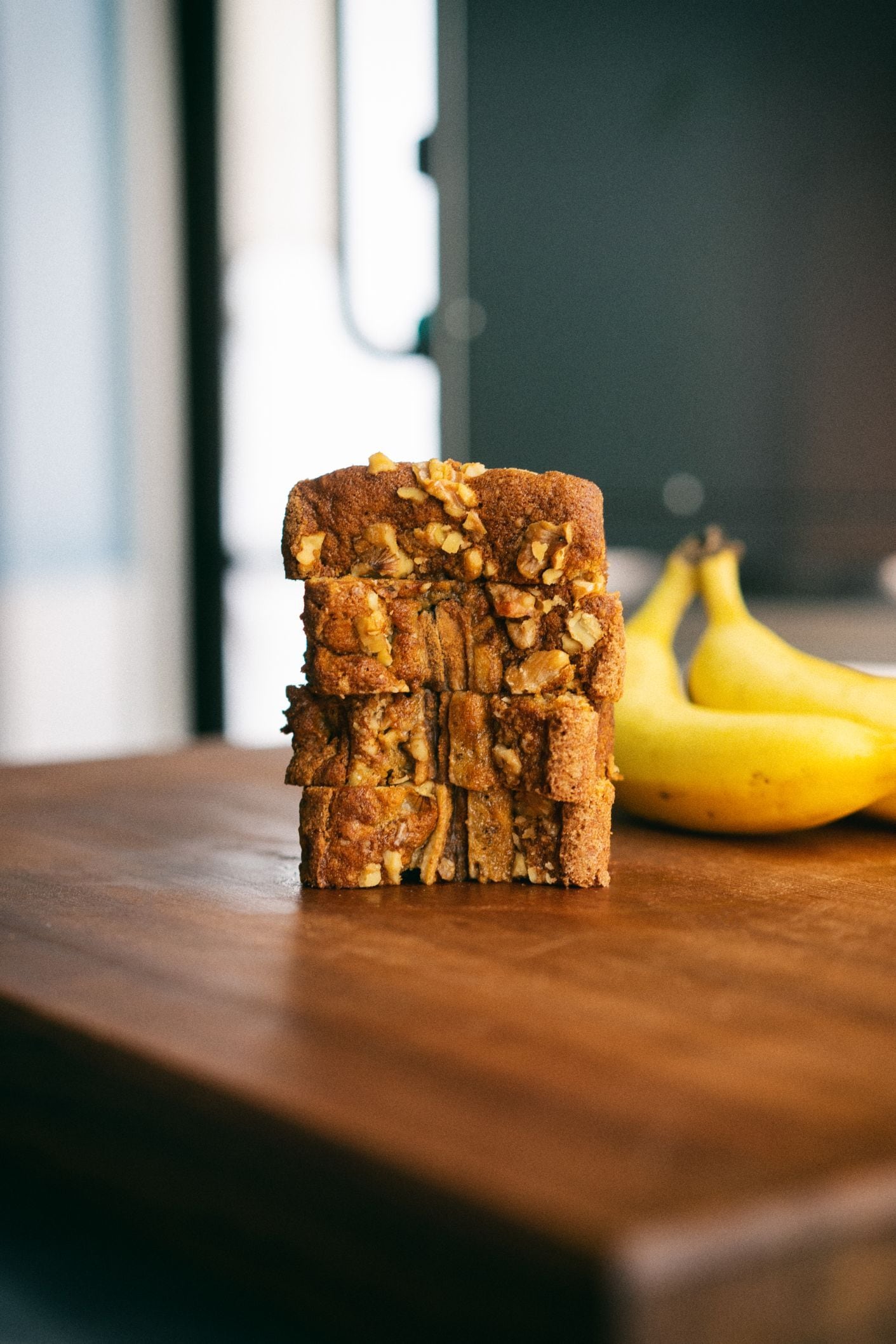 完熟バナナがたっぷりの、当店自慢のバナナブレッドです。バナナスライスと香ばしいクルミのトッピングで、見た目も華やかに仕上げました。